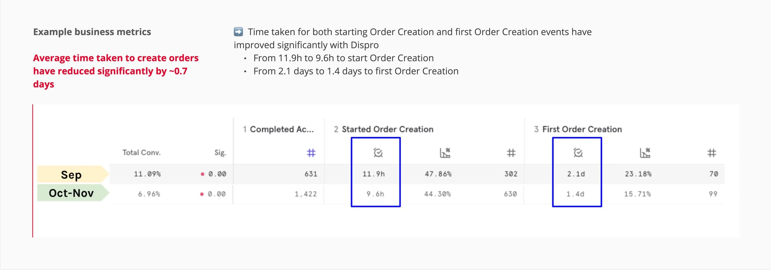 Urgency: Clear improvements. Average time to create first orders dropped from 2.1 → 1.4 days, and same-day orders increased +6%.